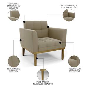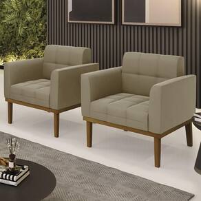 A Poltrona Decorativa é revestida em Suede, que é durável e fácil de limpar, e ainda valoriza o design da poltrona. Os braços e encosto são confortáveis em espuma D-18, já o assento é com espuma D-26 de alta densidade, que garante um assento firme e aconchegante, ideal para relaxar após um dia cansativo. A base em madeira de eucalipto é um charme à parte, que confere um toque Rústico e sofisticado à peça. São 2 poltronas com estrutura resistente que suporta até 120 kg cada. A montagem é muito simples, pois a poltrona já vem pronta, bastando apenas fixar a base com os parafusos que acompanham o produto. A limpeza também é muito prática, pois basta utilizar um pano limpo e levemente úmido, sem produtos abrasivos, para manter a sua poltrona sempre em bom estado. Sem dúvidas a Poltrona Para Sala vai transformar seu ambiente, deixando mais confortável e estiloso!