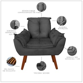 A poltrona decorativa impala proporciona um toque de charme e beleza em seu lar, feita com matéria prima de primeira qualidade, revestida de fibra e percinta no encosto e espuma no assento.Especificações:- estrutura: mdf e eucalipto- tecido: suede- pés: madeiraDimensões externas:Altura : 89 cmLargura: 86 cmComprimento: 86 cmDimensões internas:Altura encosto x assento: 53 cmAltura do chão até o assento: 50 cmProfundidade do assento: 52 cmLargura do assento: 46 cmPés palito envernizados cor melPeso suportado: até 100 kg sem impactoGarantia de fábrica 90 dias para somente defeito de fábrica. AtençãoInstruções de limpeza: utilizar um pano limpo e seco. Não limpar com escovas ou produtos abrasivos,No prazo de garantia não é permitido fazer impermeabilização, pois caso seja feita perde totalmente garantia.Obs: este produto é recomendado para ambientes residenciais em áreas internas, por isso, não o deixe exposto à luz direta do sol, para que não sofra alteração na corMontagem é simples e dever do cliente somente rosquear os pés . Em caso de devolução do produtoAceitaremos a devolução nós seguinte termos.O produto deverá ser embalado da mesma forma que foi entregue, não deverá ter rasgos ou esteja com fissuras. Deverá ser etiquetado de igual modo para que não haja extravio, deverá ter nota de devolução. O produto não poderá estar danificado ou com marcas de uso Informamos que o horário de coleta é horário somente comercial.Fica acordado que finalizar a compra estou totalmente de acordo com toda descrição a qual fui informado através do anuncio a qual afirmo no ato da finalização da compra ter lido.Qualquer duvida estamos a disposição. Marca: Decore.Com