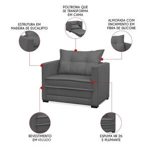 Estrutura: Madeira de Eucalipto Reflorestada Material da Espuma: Espuma HR 26 e Plumante Revestimento: Veludo Material do Encosto: Fibras siliconada Modelo: Poltrona Bicama Quantidade de Lugares: 1 Lugar Peso Suportado: 110 Kg distribuídos Possui Pés: Sim Material dos Pés: Madeira Possui Rodízios: Não Tipo de Encosto: Almofada solta, removível Tipo de Assento: Articulado É reclinável: Não Diferenciais: Poltrona que vira cama; Acompanha almofada solta, com enchimento de fibra siliconada. Complexidade da Montagem: Baixa Montagem: O produto é enviado montado Garantia: 90 dias contra de fabricação Instruções de Limpeza: Utilizar um pano limpo e levemente úmido Quantidade de Volumes: 1 Caixa Medida das Embalagens: Caixa: 102x83x80cm : É feita somente até o térreo ou portaria. Confira sempre as medidas das embalagens para assegurar que o produto passe por portas e escadas do .
