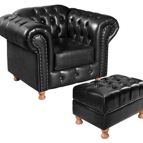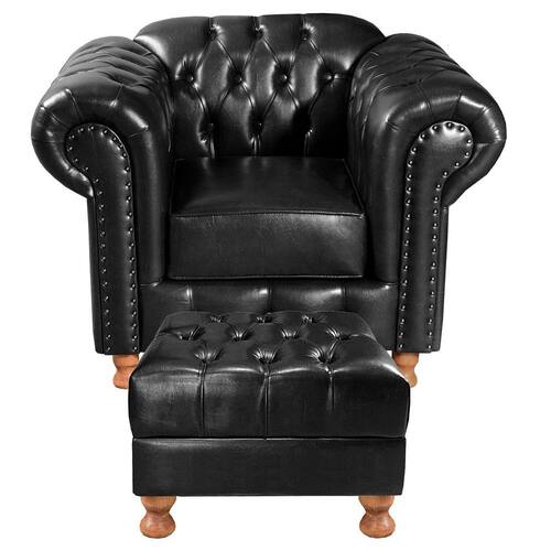É necessário que haja uma ou mais pessoas no local para receber, desembalar, e conferir o produto. Não nos responsabilizamos por montagem e desmontagem, transporte por escadas/elevadores/guincho.Eventuais despesas é de responsabilidade do cliente.Confira as dimensões deste produto e certifique-se de que passará normalmente por elevadores/portas/corredor de seu imóvel.Todos os produtos são revisados antes do envio. Acompanha Almofadas extras: Não Almofada do assento: Removível Almofada do encosto: Não Possui Altura do assento até o chão: 0 cm Altura do Encosto: 80 cm Ambiente Principal: Sala de Estar Complexidade da Montagem: Baixa: pode ser montado por uma pessoa sozinha Cor: Preto Cor do Produto: Preto Densidade do Assento: D-26 Enchimento do Assento: Espuma Estilo de Braço: Braços Redondos Firmeza do Assento: Macio Itens Inclusos: 1 Poltrona Luis XV + Puff + Pés ( Apenas Enroscar) Material dos Pés: Madeira Eucalípto Necessita Montagem: Sim Peso: 45 kg Pet Friendly: Não Possui Percintas Elásticas: Sim Possui Pés: 04 Possui Rodízio: Não Recomendações de Uso, Manutenção e Limpeza: Limpeza e cuidados: pode ser utilizado aspirador de pó, escova com cerdas macias ou limpeza a seco. Não utilizar produtos químicos, abrasivos ou limpeza a vapor. Evitar exposição prolongada ao sol. Sistema de Montagem: Enroscar os Pés Suporta Até (kg): 120 kg Tecido Predominante: Couro Sintético Tipo de Encosto: Fixo Tipo de Mola: Não Possui