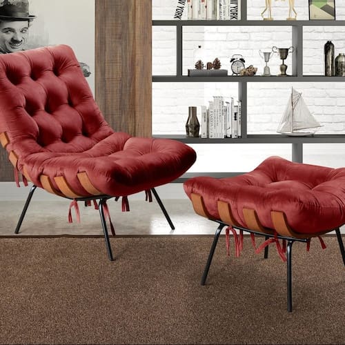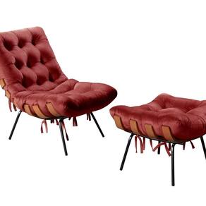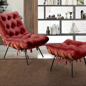 Itens inclusos: 1 Poltrona 1 Puff já montados e prontos para uso. Acompanha Almofadas extras: Não Acompanha Puff: Sim Almofada do assento: Não Possui Almofada do encosto: Não Possui Altura do assento até o chão: 50 Altura do Encosto: 85 Ambiente Principal: Sala de Estar Complexidade da Montagem: Baixa: pode ser montado por uma pessoa sozinha Cor: Bordô Cor do Produto: Bordô Design Assinado: Sim Encosto para a Cabeça: Não Estampado: Não Extensível: Não Itens Inclusos: 1 Poltrona, 1 Puff, Kit Ferragens Linha ou Coleção: Costela Material dos Pés: Madeira Eucalípto Modelo de Poltrona: Fixo Necessita Montagem: Sim Origem do Produto: Nacional Peso: 24 kg Possui Percintas Elásticas: Não Possui Pés: 04 Possui Rodízio: Não Recomendações de Uso, Manutenção e Limpeza: Limpeza e cuidados: pode ser utilizado aspirador de pó, escova com cerdas macias ou limpeza a seco. Não utilizar produtos químicos, abrasivos ou limpeza a vapor. Evitar exposição prolongada ao sol. Sistema de Montagem: Apenas Colocar os pés Suporta Até (kg): 120 Tecido Predominante: Suede Tipo de Assento: Fixo Tipo de Encosto: Fixo Tipo de Poltrona: Decorativa