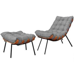 Poltrona Costela de Adão com Puff Tecido Linho Cinza