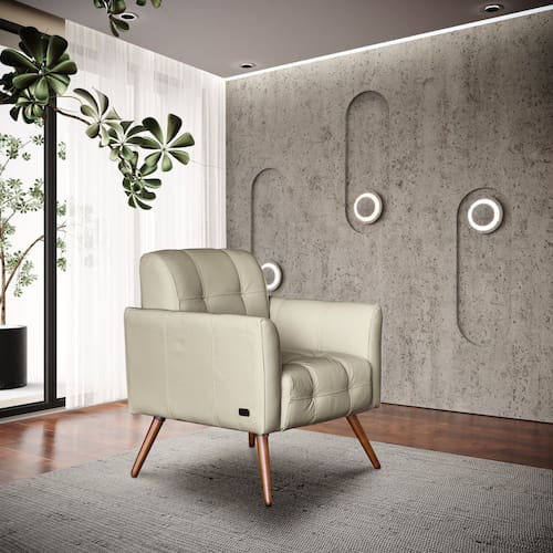 Poltrona Bia, feita para pequenos espaços, design atual, trazendo conforto e sofisticação ao seu ambiente.rn Poltrona desenvolvida com madeiras de eucalipto tratado, percintas elásticas, espuma de alta densidade e revestida em couro nas cores branco, tiza, bege, preto e marrom 100% natural. Acompanha Almofadas extras: Não Acompanha Puff: Não Almofada do assento: Fixa Almofada do encosto: Fixa Altura do assento até o chão: 43 cm Altura do Encosto: 34 cm Altura dos Pés: 25 cm Ambiente Principal: Sala de Estar Cor: Tiza Cor do Produto: Tiza Design Assinado: Não Enchimento do Assento: Espuma D-26 Enchimento do Braço: Espuma D-26 Enchimento do Encosto: Espuma D-26 Encosto para a Cabeça: Não Estampado: Não Extensível: Não Firmeza do Assento: Macio Itens Inclusos: 1 Poltrona Material do Braço: Madeira e Espuma Material dos Pés: Madeira Modelo de Poltrona: Fixo Necessita Montagem: Não Origem do Produto: Nacional Peso: 28 kg Possui Percintas Elásticas: Sim Possui Pés: 04 Possui Rodízio: Não Recomendações de Uso, Manutenção e Limpeza: Utilize pano úmido sabão neutro Suporta Até (kg): 80 kg Tecido Predominante: Couro Tipo de Assento: Fixo Tipo de Encosto: Fixo Tipo de Espuma do Assento: Espuma Convencional Tipo de Espuma do Encosto: Espuma Convencional Tipo de Poltrona: Decorativa