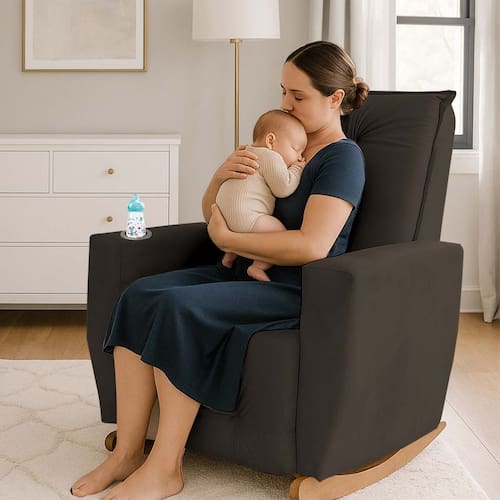 Poltrona de Amamentação Balanço Agatha Puff Poltrona Agatha amamentação proporciona todo o conforto e aconchego que a família precisa nesta fase tão especial, e encanta pelo seu estilo sofisticado. Feita com matéria-prima de alta qualidade a poltrona possui estofado revestido por tecido de toque suave que proporciona aconchego para os momentos de amamentação. O puff quadrado traz conforto e beleza para a rotina da mamãe, e ajuda no descanso para pernas e pés tornando o momento ainda mais confortável. A poltrona possui um balanço suave em sua base, e um encosto alto com espuma de excelente densidade e estrutura sólida de madeira.