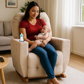 Poltrona Antonela amamentação proporciona todo o conforto e aconchego que a família precisa nesta fase tão especial, e encanta pelo seu estilo sofisticado. Feita com matéria-prima de alta qualidade a poltrona possui estofado revestido por tecido de toque suave que proporciona aconchego para os momentos de amamentação. O puff quadrado traz conforto e beleza para a rotina da mamãe, e ajuda no descanso para pernas e pés tornando o momento ainda mais confortável. A poltrona possui um balanço suave em sua base, e um encosto alto com espuma de excelente densidade e estrutura sólida de madeira.