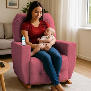 Poltrona Antonela amamentação proporciona todo o conforto e aconchego que a família precisa nesta fase tão especial, e encanta pelo seu estilo sofisticado. Feita com matéria-prima de alta qualidade a poltrona possui estofado revestido por tecido de toque suave que proporciona aconchego para os momentos de amamentação. O puff quadrado traz conforto e beleza para a rotina da mamãe, e ajuda no descanso para pernas e pés tornando o momento ainda mais confortável. A poltrona possui um balanço suave em sua base, e um encosto alto com espuma de excelente densidade e estrutura sólida de madeira.