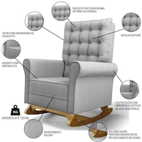 Uma Poltrona de Balanço feita com materiais de alta qualidade, estrutura em madeira de eucalipto, o tecido linho macio e resistente, e a espuma D23 a densidade ideal para o seu conforto, base em madeira com um lindo design e balanço suave, que ajuda a relaxar e a embalar o sono do seu bebê. O Kit Poltrona e Puff possui um design moderno e sofisticado, com detalhes em botonê revestido no encosto, que dão um toque de charme e elegância ao ambiente. A Poltrona de Amamentação também acompanha um puff pés madeira tecido linho, que serve como apoio para os pés ou como assento extra. O puff tem o mesmo acabamento da poltrona, criando um conjunto harmonioso e bonito.