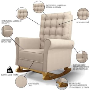 Uma Poltrona de Balanço feita com materiais de alta qualidade, estrutura em madeira de eucalipto, o tecido linho macio e resistente, e a espuma D23 a densidade ideal para o seu conforto, base em madeira com um lindo design e balanço suave, que ajuda a relaxar e a embalar o sono do seu bebê. O Kit Poltrona e Puff possui um design moderno e sofisticado, com detalhes em botonê revestido no encosto, que dão um toque de charme e elegância ao ambiente. A Poltrona de Amamentação também acompanha um puff pés madeira tecido linho, que serve como apoio para os pés ou como assento extra. O puff tem o mesmo acabamento da poltrona, criando um conjunto harmonioso e bonito.