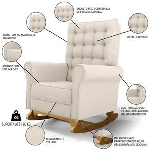Uma Poltrona de Balanço feita com materiais de alta qualidade, estrutura em madeira de eucalipto, o tecido Veludo macio e resistente, e a espuma D23 a densidade ideal para o seu conforto, base em madeira com um lindo design e balanço suave, que ajuda a relaxar e a embalar o sono do seu bebê. O Kit Poltrona e Puff possui um design moderno e sofisticado, com detalhes em botonê revestido no encosto, que dão um toque de charme e elegância ao ambiente. A Poltrona de Amamentação também acompanha um puff pés madeira tecido Veludo, que serve como apoio para os pés ou como assento extra. O puff tem o mesmo acabamento da poltrona, criando um conjunto harmonioso e bonito.