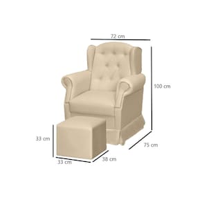 Medidas Poltrona Altura Total: 100 cm Largura Total: 74 cm Profundidade Total: 75 cm Largura do Assento: 45 cm Altura Encosto: 60 cm Puff Altura - 33cm Largura - 33cm Profundidade - 38cm Características do produto A estrutura interna é feita em madeira de eucalipto reflorestada. Assento em Espuma - D23 Encosto em espuma - Fixo D20 Produto montado