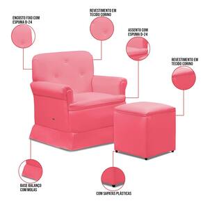 A Poltrona com Puff Lígia é uma excelente escolha para quem busca conforto, elegância e funcionalidade em um único produto. Ideal para compor espaços voltados ao cuidado infantil, como quartos de bebê ou áreas de descanso, ela combina um design moderno com materiais de alta qualidade. Sua estrutura é fabricada em madeira de eucalipto reflorestada, oferecendo resistência e durabilidade. O revestimento em tecido sintético proporciona um toque sofisticado e combina facilmente com diversos estilos de decoração. O enchimento em espuma D-24 garante conforto e suporte adequados para longos períodos de uso, enquanto as percintas elásticas no assento e o detalhe em botonê no encosto contribuem para uma experiência de descanso ainda mais agradável. A poltrona possui um sistema de balanço com molas que proporciona um movimento suave e contínuo, ideal para relaxar em momentos de tranquilidade e conexão. Acompanha um puff revestido no mesmo tecido da poltrona, que permite apoiar os pés de forma confortável, favorecendo uma postura relaxada. Além do conforto, o produto se destaca pela praticidade: possui montagem simples, baixo nível de complexidade e já vem montado, pronto para uso.