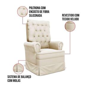 A Poltrona de Amamentação é um móvel indispensável na vida da mamãe e do recém-nascido. Geralmente nos iros meses, os horários de amamentação são mais frequentes, tendo que ficar de duas ou de três em três horas na mesma posição, não é mesmo? Mas, será que é preciso mesmo ter uma poltrona? Não é apenas luxo? Vale a pena lembrar que, ter uma poltrona, vai além da decoração apenas, é uma peça indispensável que garante muito mais segurança e conforto, tanto para o bebê, quanto para a mãe caso pegue no sono durante a amamentação. Por isso, oferecemos o que há de melhor! Olha que lindeza a Poltrona de Amamentação Laura! Com estofamento de qualidade, essa poltrona possui encosto de fibra, revestida com veludo, sistema de balanço com molas. Produzida em madeira maciça, com encosto alto, sua ergonomia foi desenvolvida pensando no conforto, bem estar sem sobrecarregar a coluna. Seu encosto/assento é feito com espumas de alta densidade D28 e percinta elástica. Os braços são do tamanho ideal para dar apoio à mamãe enquanto segura o bebê. Contém também um revestimento de excelente qualidade em Veludo, um tecido de toque suave e super fácil de limpar! E para complementar essa linda peça, contém um puff, que além de servir de apoio para os pés, ajuda a combater o inchaço das pernas. O tom Bege COR404, é uma cor extremamente elegante e perfeita! Escolha sua Poltrona de Amamentação Laura e garanta o melhor proveito do momento de amamentação com seu filho(a).