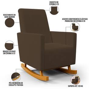 Desfrute de momentos especiais de amamentação e relaxamento com a Poltrona de Amamentação com Balanço e Puff Ravena Suede Marrom, da Lyam Decor. Fabricada com estrutura em madeira de eucalipto tratada e os pés balanço estilo canoa, esse modelo proporciona estabilidade e , permitindo que você se entregue ao conforto absoluto durante esse tempo de vínculo entre mãe e filho. Além disso, o design moderno e elegante dessa poltrona de balanço é perfeito para mamães que buscam o máximo de conforto para si e para o bebê, uma vez que a poltrona conta com assento tapeçado com espuma D-26 e o encosto e braças D-23. Já o puff serve de apoio extra para os pés durante esse período, garantindo uma experiência de amamentação tranquila e aconchegante.