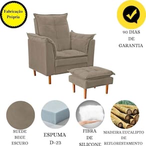 A Poltrona Confortável Angelina possui estrutura em madeira de eucalipto e é revestida em suede, garantindo uma maciez inigualável ao toque. O puff, um componente essencial, oferece conforto adicional para os pés, tornando cada momento ainda mais agradável.