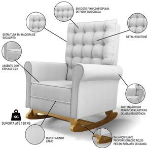 Uma Poltrona de Balanço é feita com materiais de alta qualidade, estrutura em madeira de eucalipto, o tecido linho macio e resistente, percintas elásticas no assento e encosto, e a espuma D23 a densidade ideal para o seu conforto, base em madeira com um lindo design e balanço suave, que ajuda a relaxar e a embalar o sono do seu bebê. A Poltrona de Amamentação, possui um design moderno e sofisticado, com detalhes em botonê revestido no encosto, que dão um toque de charme e elegância ao ambiente.