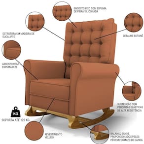 Altura: 105 cm | AssemblyRequired: Sim, sugerimos a contratação do nosso serviço de montagem (para os CEPs em que o serviço está dispon | Color: Terracota | ColorFamily: Terracota | ColorSimple: Terracota | ColorSupplier: Terracota | Cor: Terracota | Gênero: Unisex | Largura: 70 cm | Manual: Sim | Marca: Mpozenato | Material: Madeira de Eucalipto | MaterialFamily: Madeira de Eucalipto | Model: Brenda | Origem: | OriginCountry: | OriginState: PR | Peso: 25 kg | Peso Suportado: 120 kg | ProductContents: 1 Poltrona, 1 Base Canoa | ProductHeight: 105 | ProductInstructions: Produto para uso em ambiente interno, nao devendo ficar exposto ao sol, calor e umidade excessivos. | ProductLength: 77 | ProductWarranty: 90 dias após o do produto | ProductWeight: 25 | ProductWidth: 70 | Profundidade: 77 cm | Requere montagem: Sim | SizeDescription: 105 x 70 x 77 cm | SupplierSimpleName: Poltrona de Amamentação e Descanso Base Madeira Balanço Brenda G05 Veludo Terracota - Mpozenato | Tipo de : Fabricante