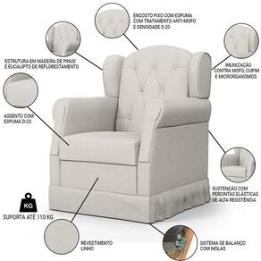 Diferenciais: - Estrutura de madeira com imunização contra mofo, cupim e microrganismos. - Travamento de estrutura com grampos em aço galvanizado. - Sustentação do assento e encosto com percintas elásticas. - Base com balanço. - Acompanha Puff.