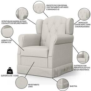 A Poltrona de Amamentação e Descanso Fixa com Puff Lucy P04 Linho Off White - Mpozenato é ideal para as mamães que buscam conforto e praticidade na hora de cuidar do seu bebê. Ela é feita de Tecido Linho, bonito, moderno e combina com qualquer ambiente. A estrutura é de madeira Eucalipto e Pinus de Reflorestamento imunizada contra mofo, cupim e microrganismos, garantindo durabilidade e segurança. A Base Fixa tem uma estrutura firme, enquanto o puff serve como apoio para os pés. A poltrona tem um design moderno e elegante, que vai deixar o seu quarto ou sala mais bonito e aconchegante. Disponível nas versões com Base Fixa e com Base Balanço, verifique as especificações do produto e adquira já a sua!