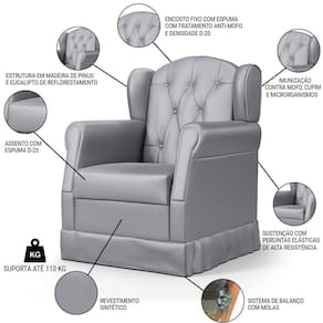 A Poltrona de Amamentação Fixa com Puff Lucy P04 Sintético Cinza - Mpozenato é ideal para as mamães que buscam conforto e praticidade na hora de cuidar do seu bebê. Ela é feita de Tecido Sintético, que é fácil de limpar e combina com qualquer ambiente. A estrutura é de madeira Eucalipto e Pinus de Reflorestamento imunizada contra mofo, cupim e microrganismos, garantindo durabilidade e segurança. A Base Fixa tem uma estrutura firme, enquanto o puff serve como apoio para os pés. A poltrona tem um design moderno e elegante, que vai deixar o seu quarto ou sala mais bonito e aconchegante. Disponível nas versões com Base Fixa e com Base Balanço, verifique as especificações do produto e adquira já a sua!