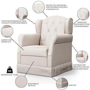A Poltrona de Amamentação Fixa Lucy P04 Sintético Bege - Mpozenato é a escolha perfeita para as mamães que buscam conforto e praticidade durante a amamentação. Fabricada com madeira de eucalipto de reflorestamento, ela é resistente e durável, além de ser ecologicamente correta. A poltrona conta com percintas elásticas, que oferecem maior conforto e durabilidade, e sua estrutura de madeira é imunizada contra mofo, cupim e microrganismos, garantindo que ela dure por muito tempo. Com um design moderno e elegante, a Poltrona de Amamentação Fixa Lucy é a escolha perfeita para qualquer ambiente, seja no quarto do bebê, na sala de estar ou em qualquer outro cômodo. Invista em conforto e qualidade para você e seu bebê com a Poltrona de Amamentação Fixa Lucy. Compre já!