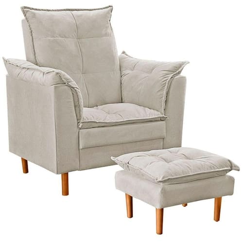 A Poltrona Confortável Melina possui estrutura em madeira de eucalipto e é revestida em suede, garantindo uma maciez inigualável ao toque. O puff, um componente essencial, oferece conforto adicional para os pés, tornando cada momento ainda mais agradável.