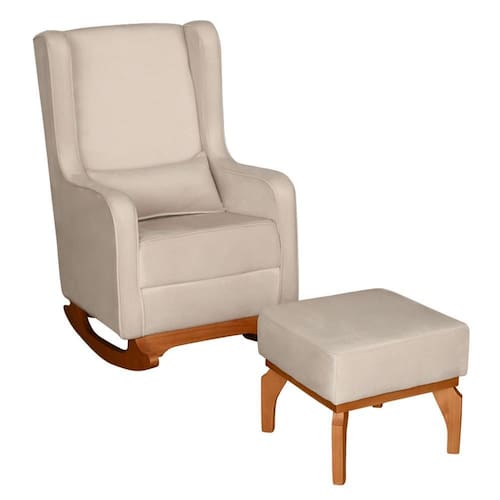 A Poltrona de Amamentação Retrô com Balanço Pés Canoa e Puff une conforto, estilo e funcionalidade em um só produto. Com estrutura em madeira de eucalipto, espuma D-23 e percintas elásticas, oferece o suporte ideal para os momentos de amamentação. O design retrô ganha charme com a base em madeira maciça tipo canoa, que proporciona um balanço suave e relaxante. Acompanha uma almofada para maior conforto e um puff com pés em madeira maciça, suporta até 130kg.