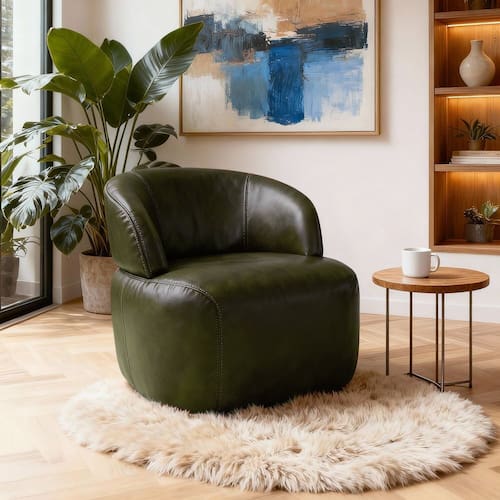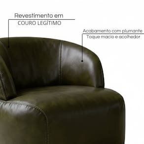 Informações Adicionais: Imagens ilustrativas, cores podem variar. Uso interno. Verifique embalagem no recebimento. Montagem por conta do cliente. Não realizamos subida. Garantia: 90 dias. Acompanha Almofadas extras: Não Acompanha Puff: Não Almofada do assento: Fixa Almofada do encosto: Não Possui Altura do assento até o chão: 45 cm Altura do Encosto: 35 cm Ambiente Principal: Sala de Estar codigo_ean: 7900288241566 Cor: Musgo Cor do Produto: Musgo Design Assinado: Não Enchimento do Assento: Espuma D-33 Enchimento do Braço: Espuma D-18 Encosto para a Cabeça: Não Estampado: Não Extensível: Não Firmeza do Assento: Médio Informações Complementares: Evitar exposição direta à luz solar, limpar com escova com pano úmido semanalmente, não utilizar produtos químicos, removedores, alvejantes, etc. Evite exercer pressão excessiva sobre determinada partes do estofado, não utilizar para limpeza equipamentos Itens Inclusos: 1 Poltrona Linha ou Coleção: Luna Marca: LEME MOVELARIA Material do Braço: COURO Modelo de Poltrona: Giratório Necessita Montagem: Não Origem do Produto: Nacional Peso: 15 kg Possui Percintas Elásticas: Sim Possui Pés: Não Recomendações de Uso, Manutenção e Limpeza: Pano limpo e levemente úmido Suporta Até (kg): 100 kg Tecido Predominante: Couro Tipo de Assento: Fixo Tipo de Encosto: Fixo Tipo de Espuma do Assento: Espuma Convencional Tipo de Poltrona: Decorativa
