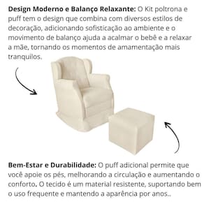 A poltrona de amamentação confortável foi projetada para oferecer conforto, com balanço suave e o puff garantem apoio total para os pés, reduzindo tensões e proporcionando relaxamento.