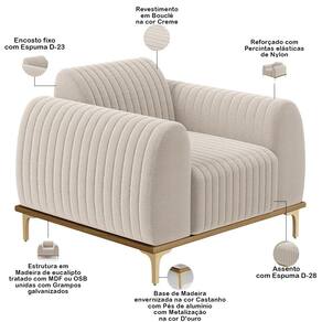 Altura: 78 cm | Color: Bege | ColorFamily: Bege | ColorSimple: Bege | ColorSupplier: Creme | Cor: Creme | Cor dos pés: Ouro | Densidade da espuma do assento: D-28 | Desenho do tecido: Liso | Estilo: Moderno | Fabricante: Lyam Decor | Formato do sofá: Linear | Largura: 110 cm | Linha: Sala de Estar, Living | Material: Estrutura em madeira reflorestada de eucalipto tratado, MDF ou OSB, unidas com grampos galvanizados | Material de enchimento do encosto: Espuma D-23 | Material do estofamento: Bouclê | MaterialFamily: Tecido, Madeira | Mecanismo de abertura do produto: -1 | Model: Molino | Orientação do Sofá: -1 | OriginCountry: | OriginState: PR | Peso: 20 kg | Peso máximo suportado: 120 kg | ProductContents: 01 Poltrona | ProductHeight: 110 cm | ProductInstructions: Produto para uso em ambiente interno, nao devendo ficar exposto ao sol, calor e umidade excessivos. | ProductLength: 85 cm | ProductWarranty: 90 dias após o do produto | ProductWeight: 20 kg | ProductWidth: 78 cm | Profundidade: 85 cm | Quantidade de Caixas de embalagem: 1 | Requer montagem: Não | SizeDescription: Altura: 78 cm x Largura: 110 cm x Profundidade: 80 cm | SupplierSimpleName: Poltrona Decorativa Base De Madeira Castanho e Pés Metalizado DOuro Molino D02 Bouclê Creme B-54 - | Tipo de produto: Poltrona | Unidades por kit: 1