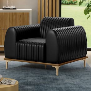 poltrona decorativa ainda é revestida em tecido PU, que além de agregar charme, também confere maior resistência e durabilidade.
