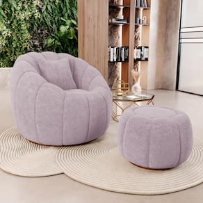 Poltrona Decorativa Concha Giratória com Puff Estilo Abóbora Shell Bouclê Rosé - Desk Design - Rosê