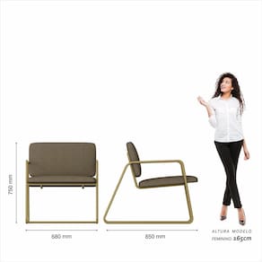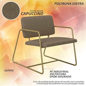 Detalhes Técnicos das Poltronas - Assento e Encosto Tapeçados, Estofados e Fixos - Espuma do Assento e do Encosto: D20 - Tonalidade: Dourado/Suede Capuccino - Material: Metalon - Medida Poltrona: A: 75CM x L: 68CM x P: 85CM - Medida do chão até o assento: 45cm de altura - Poltrona suporta até 120KG - Montagem: Difícil