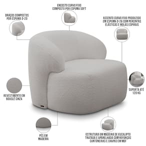 Características: Estrutura em madeira de eucalipto tratada e aparelhada com reforços, cantoneiras e chapas em MDF. Revestimento em tecido Bouclê de alta qualidade na cor Cinza. Encosto curvo fixo composto por espuma soft. Assento curvo fixo composto por espuma D-26 e molas espirais. Percintas elásticas no assento para maior resistência e durabilidade. Braços compostos por espuma D-20. Pés em madeira. Peso suportado: Até 120 kg.