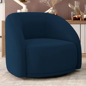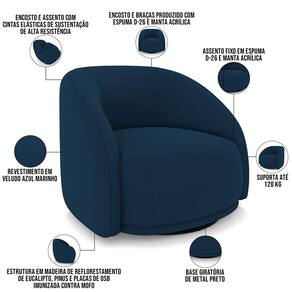Características: Estrutura em madeira de reflorestamento de eucalipto, pinus e placas de OSB e imunizada contra mofo, cupim e microorganismos. Revestimento em Veludo na cor Azul Marinho. Encosto e assento com cintas elásticas de sustentação de alta resistência. Assento, encosto e braças com espuma D-26 e manta acrílica. Base giratória de metal preto. Peso suportado: Até 120 kg.
