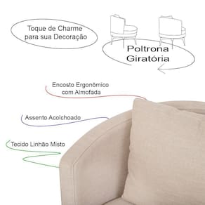 AS IMAGENS SÃO MERAMENTE ILUSTRATIVAS E PODEM SOFRER VARIAÇÕES DE COR E PEQUENOS DETALHES DE ACORDO COM O SEU MONITOR, ILUMINAÇÃO DO AMBIENTE E ATÉ MESMO A SUA PERCEPÇÃO VISUAL.Poltrona Decorativa GiratÃria Cora em Linho Misto Bege