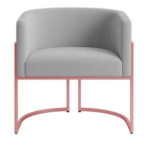 Revestida em tecido veludo, proporciona toque macio e brilho sofisticado, realçando sua presença em qualquer ambiente. Os pés metálicos com pintura rosê complementam a elegância da peça, adicionando um detalhe refinado à sua base.