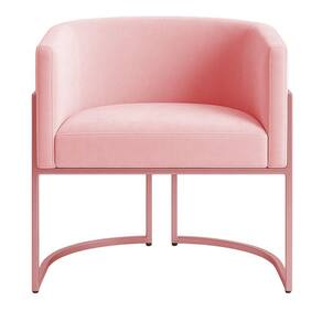 Revestida em tecido veludo, proporciona toque macio e brilho sofisticado, realçando sua presença em qualquer ambiente. Os pés metálicos com pintura rosê complementam a elegância da peça, adicionando um detalhe refinado à sua base.