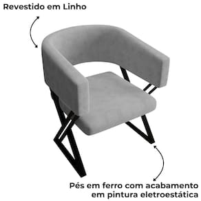 Poltrona Decorativa Mirela, design escultural que une conforto e sofisticação em uma só peça! Estrutura em MDF, estofada com espuma (D14 encosto/ D26 assento) reforçada com percintas elásticas e revestida em tecido Linho. Seus pés em metal com formato geométrico e acabamento em pintura eletrostática, trazem modernidade para o produto, assim como o detalhe arredondado no encosto. Suporta até 120 kg. Produto será entregue em 1 volume.