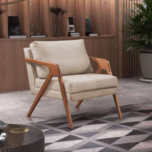 Poltrona Decorativa Mona Premium Base Madeira Maciça Veludo Bege