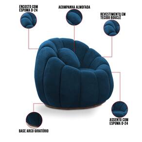 A Poltrona Cloud é uma peça que combina formas artísticas, conforto e durabilidade. Ela tem um design orgânico que remete às formas encontradas na natureza como as nuvens criando um espaço acolhedor e relaxante. Além da sua simetria e curvas suaves, ela contém uma Base Giratória e um revestimento em tecido Bouclê Azul Marinho , que cria uma conexão entre a peça e o ambiente. Pode ser utilizada em sala de estar, recepções, escritórios, lojas e espaços comerciais, ou qualquer outro espaço que você queira decorar com estilo e bom gosto. Ela tem uma estrutura em madeira de reflorestamento eucalipto, que garante a resistência e a sustentabilidade do produto. Ela suporta até 120 kg de peso, podendo ser utilizada por pessoas de diferentes biotipos. Inclui almofada solta com enchimento de fibra siliconada, oferecendo versatilidade para diferentes usos e necessidades. Ela tem um acabamento reforçado e espuma de qualidade D24, que oferece maciez e aconchego. Ela apresenta detalhes de costura refinados em formato arredondado resultando em um acabamento impecável conferindo muito mais valor e elegância ao produto. Ela é fácil de transportar, pois tem um peso leve e um tamanho compacto. A Poltrona Cloud é um produto que vai fazer a diferença na sua decoração e no seu bem-estar. Garanta já a sua!