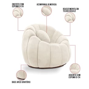 A Poltrona Cloud é uma peça que combina formas artísticas, conforto e durabilidade. Ela tem um design orgânico que remete às formas encontradas na natureza como as nuvens criando um espaço acolhedor e relaxante. Além da sua simetria e curvas suaves, ela contém uma Base Giratória e um revestimento em tecido Bouclê Bege, que cria uma conexão entre a peça e o ambiente. Pode ser utilizada em sala de estar, recepções, escritórios, lojas e espaços comerciais, ou qualquer outro espaço que você queira decorar com estilo e bom gosto. Ela tem uma estrutura em madeira de reflorestamento eucalipto, que garante a resistência e a sustentabilidade do produto. Ela suporta até 120 kg de peso, podendo ser utilizada por pessoas de diferentes biotipos. Inclui almofada solta com enchimento de fibra siliconada, oferecendo versatilidade para diferentes usos e necessidades. Ela tem um acabamento reforçado e espuma de qualidade D24, que oferece maciez e aconchego. Ela apresenta detalhes de costura refinados em formato arredondado resultando em um acabamento impecável conferindo muito mais valor e elegância ao produto. Ela é fácil de transportar, pois tem um peso leve e um tamanho compacto. A Poltrona Cloud é um produto que vai fazer a diferença na sua decoração e no seu bem-estar. Garanta já a sua!