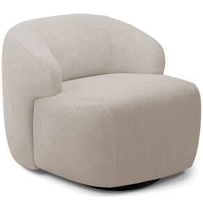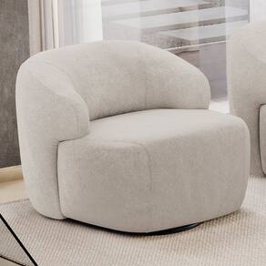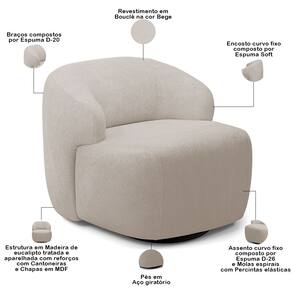 Características: Estrutura em madeira de eucalipto tratada e aparelhada com reforços, cantoneiras e chapas em MDF. Revestimento em Bouclê de alta qualidade na cor Bege. Encosto curvo fixo composto por espuma soft. Assento curvo fixo composto por espuma D-26 e molas espirais. Percintas elásticas no assento para maior resistência e durabilidade. Braços compostos por espuma D-20. Pés em aço giratório. Peso suportado: Até 120 kg.