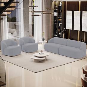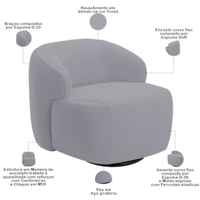 Características: Estrutura em madeira de eucalipto tratada e aparelhada com reforços, cantoneiras e chapas em MDF. Revestimento em Veludo de alta qualidade na cor Cinza Encosto curvo fixo composto por espuma soft. Assento curvo fixo composto por espuma D-26 e molas espirais. Percintas elásticas no assento para maior resistência e durabilidade. Braços compostos por espuma D-20. Pés em aço giratório. Peso suportado: Até 120 kg.
