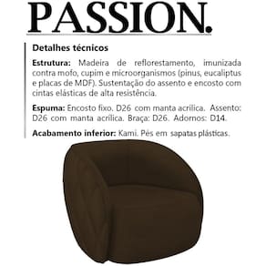 Poltrona Decorativa Passion Veludo, ideal para deixar seu ambiente com um design moderno e versátil, sem abrir mão da qualidade e conforto. Estrutura em madeira de reflorestamento (pinus, eucaliptos e placas de MDF) e cintas elásticas de alta resistência. Composta por madeira imunizada contra mofo, cupim e microrganismos, revestimento em tecido veludo, encosto fixo em espuma D-26 com manta acrílica, assento em espuma D-26 com manta acrílica, braça em espuma D-26, adornos em espuma D-14, acabamento inferior em kami, acompanha sapatas plásticas. É perfeita para acomodar visitas e convidados, ideal para ser utilizada em salas, hall de entrada e escritórios. Este móvel chegará na sua casa separado em 01 volume.