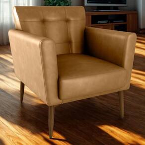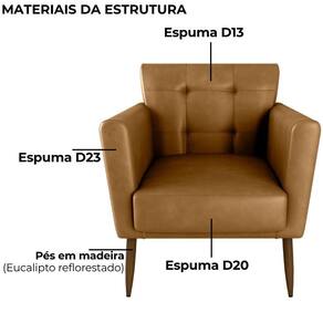 Poltrona Cancun, estilo retrô e toque de sofisticação para seu ambiente. Estrutura em Madeira de Eucalipto (reflorestamento) reforçada com percintas elásticas, estofada com espumas D20 (assento), D23 (braças) e D13 (encosto). Revestida em tecido Frankfurt Montana (Corino, material sintético que imita couro), com detalhes em costura quadriculada no encosto, possui 4 pés palito também em madeira. Este produto será entregue em 01 volume.
