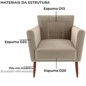 Poltrona Cancun, estilo retrô e toque de sofisticação para seu ambiente. Estrutura em Madeira de Eucalipto (reflorestamento) reforçada com percintas elásticas, estofada com espumas D20 (assento), D23 (braças) e D13 (encosto). Revestida em tecido Veludo (toque suave e acabamento sofisticado), com detalhes em costura quadriculada no encosto, possui 4 pés palito também em madeira. Este produto será entregue em 01 volume.