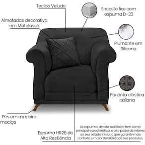 Modelo: Poltrona Decorativa Retrô Polo Com Almofada Veludo Pés: Madeira Maciça Assento: Fixo com espuma D23 e plumante em silicone Encosto: Fico com percintas elásticas italiana, espuma HR28 e plumante em silicone Sistema de Montagem: Necessário fixar os pés
