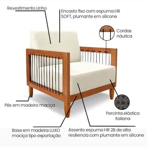 Base e pés: Madeira Maciça Eucalipto Espuma: HR 28 - poliuretano de alta resiliência Tecido: Linho