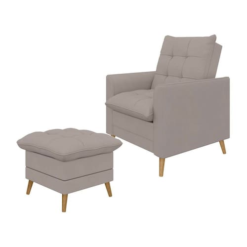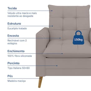 Conteúdo da Embalagem: 1 Poltrona e 1 Puff Características: Marca: Just Time Modelo: York Revestimento: Veludo de Alto Padrão Estrutura: Eucalipto tratado, proviniente de Silvicultura Percinta: Italiana, maior qualidade e conforto Espuma: D26 - Espuma Cerificada