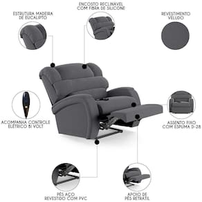 Madeira de EucaliptoImagine transformar sua Sala De Estar em um espaço de entretenimento de última geração com a Poltrona do Papai Reclinável Kalie Controle Power Elétrico FH9 Veludo Cinza, da Mpozenato!